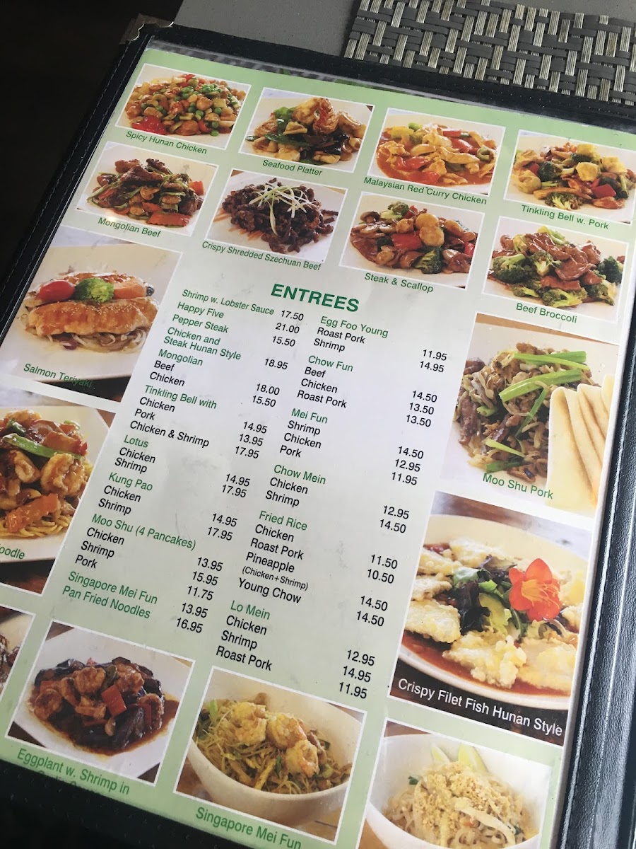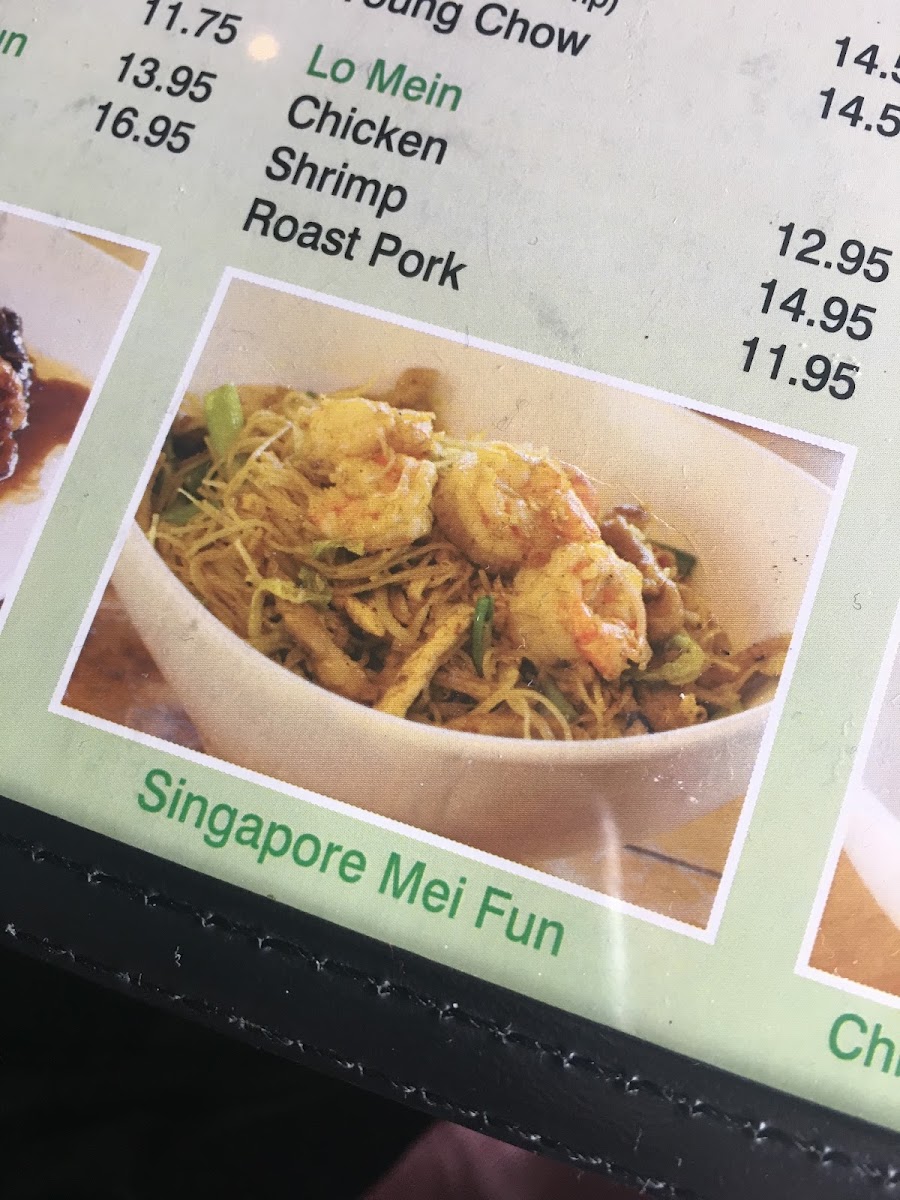 Mei Fun: Rice Angel Hair Noodle, Chinese Cabbage, Bean Sprouts, and Carrots in a Brown Soy Sauce choice of protein Singapore Style: Rice Angel Hair Noodles, Sautéed Shrimp, Roast Pork and White Meat Chicken Breasts, Onion, Bean Sprouts, Chinese Cabbage, and Red Bell Peppers in a Spicy Curry Sauce.